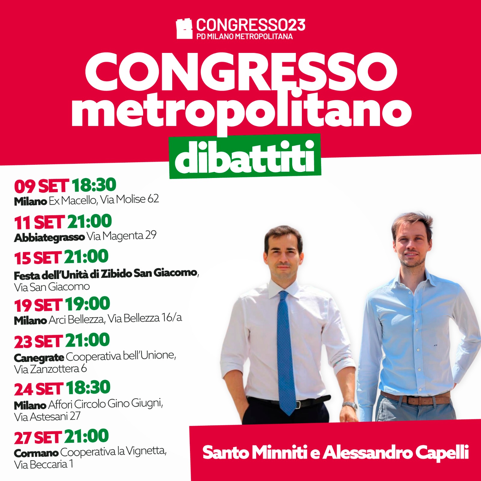 Dopo il primo dibattito a Villapizzone, ecco le altre date dei dibattiti tra i due candidati per il Congresso della Federazione di Milano metropolitana. Santo Minniti e Alessandro Capelli si confronteranno e presenteranno le rispettive mozioni congressuali agli iscritti del Partito Democratico che saranno chiamati a scegliere il prossimo Segretario Metropolitano.